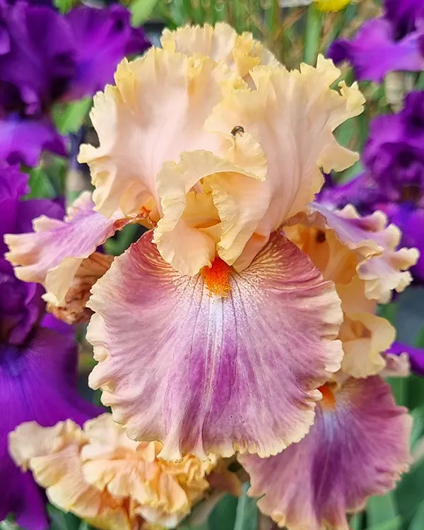 ‘Act Of Kindness’ (Joseph Ghio, R. 2000). Seedling 96-43M. TB, 34″ (86 cm), Early midseason bloom. Standards apricot orange; falls blended orchid and rose, edge apricot; beards tangerine.’Mandela’ X seedling 94-63U2: (seedling 92-73F3, ‘Lanai’ sibling x ‘Fashion Designer’). Bay View 2001. Honorable Mention 2003.
