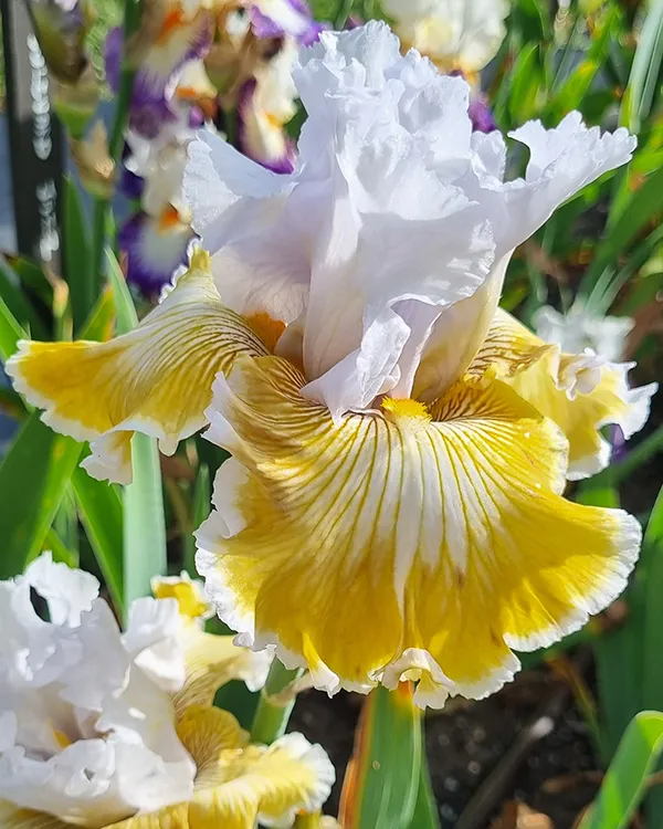 ‘Baby I Love You’ (Paul Black, R. 2011). Seedling# P209TJ. TB, 35″ (89 cm). Midseason to late bloom. Standards icy white, gold flush over base; style arms icy white, chartreuse gold edges and crest tips; falls white, hafts heavily veined olive, white center patch finely veined chartreuse then blending from light to darker olive-chartreuse then to a blended white band; beards white base, tips mid-orange; pronounced sweet fragrance. Blyth seedling# L201-1: (‘Candy Clouds’ x seedling# H129-1, ‘Safari Sunset’ sibling) X Blyth seedling# O8: (‘Cast Of Characters’ x ‘Decadence’). Mid-America 2012. Honorable Mention 2014, Award of Merit 2017.