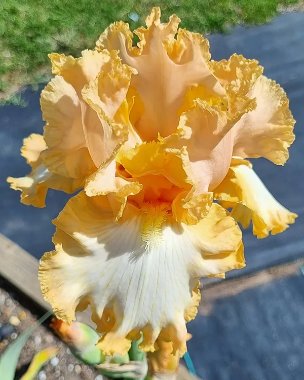 ‘Barbara My Love’ (William Maryott, R. 1998). Seedling# X194A. TB, height 36″ (91 cm), Midseason bloom. Standards pale salmon (RHS 27A); style arms deep gold; falls white, 3/8″ spanish orange (26D) band; beards yellow, orange in throat; slight sweet fragrance. Seedling# S198B: (seedling# N110Yel: (‘Chief Redskin’ x ‘Bronco Brown’) x ‘Speculator’) X seedling# S216C: (‘Oktoberfest’ x ‘Good Show’). Maryott 1999.