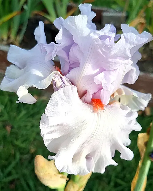 ‘Bliss Bomb’ (Lesley Blyth, R. 2001). Seedling# L96-3-4. TB, 38″ (97 cm). Late midseason bloom. Standards pastel orchid lilac to white; falls pastel orchid lilac, lighter toward center; beards brilliant coral red; ruffled, laced; slight sweet fragrance. ‘Coming Up Roses’ X ‘Cloud Berry’. Tempo Two 2001/02