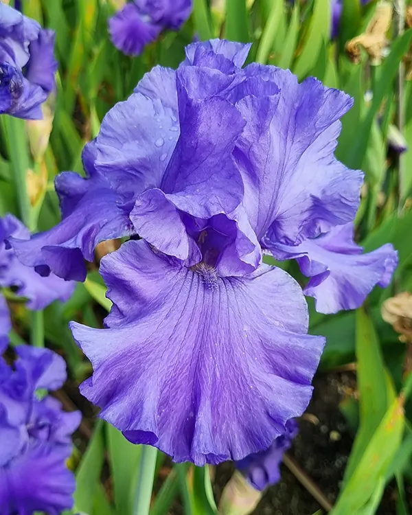 ‘Blueberry Bliss’ (Schreiner, R. 2004). Seedling# JJ 590-1. TB, 40″ (107 cm), Early midseason bloom. Medium blue self (RHS 89A); beards blue, yellow in throat. Seedling# GG 77-A: (seedling# DD 128-1: (‘Olympiad’ x ‘Honky Tonk Blues’) x ‘Royal Intrigue’) X ‘Tokatee Falls’. Schreiner 2004
