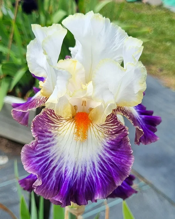 ‘Boulevard Jazz’ (Barry Blyth, R. 2009). Seedling# Q28-3. TB, 33” (84 cm), Midseason bloom. Standards white, fine lemon wire edge; falls lavender, large white starburst radiating out and blending into lavender, edge more buff to red violet; beards vivid tangerine, lighter at end. Keppel seedling# 99-53A: (seedling# 96-50F, Rio sibling x seedling#96-47B: (‘Prince George’ x ‘Braggadocio’)) X Keppel seedling# 01-81D: (seedling# 96-50E, ‘Rio’ sibling x seedling# 98-173D: (‘Balderdash’ x ‘Starring’)). Tempo Two 2009/10.