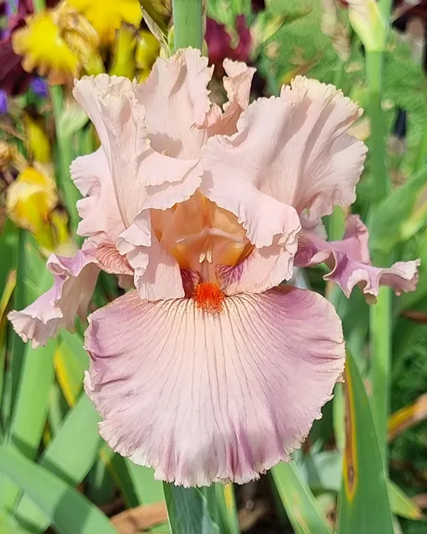 ‘Bracken Ridge’ (Graeme Grosvenor, R. 2011). Seedling# D72-04-2. TB, 36 (91 cm), Late midseason bloom. Standards apricot, peach edge, darker peach at base; falls apricot overlaid mauve pink, darker toward edge, peach wire edge; beards red. Seedling#Z8-1: (‘Celebration Song’ x ‘Romantic Evening’) X ‘Bubble Up’.