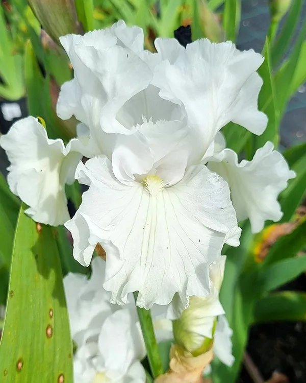 ‘Bridal Fashion’ (John Weiler, R. 1986). Seedling# 79-125-3. TB, 33″ (86 cm), Early to midseason bloom. Heavily ruffled cool white; white beard tipped yellow; slight sweet fragrance. ‘Thick And Creamy’ X seedling#75-47-2: (seedling# 73-22: ((‘Pacific Panorama’ x ‘Seaside’) x ‘Wedding Vow’) x ‘Bridal Wreath’). Rialto Gardens 1986.
