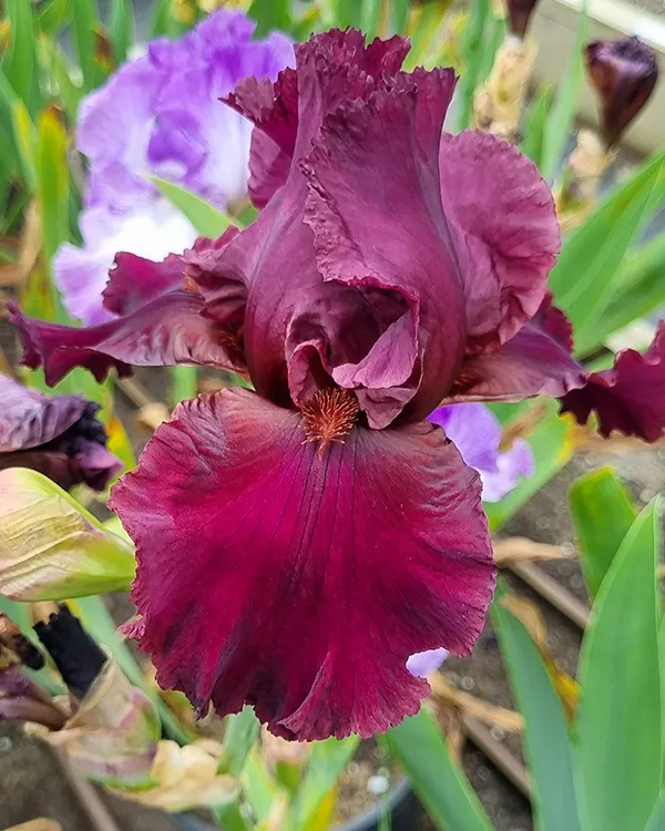 ‘Burgundy Bubbles’ (Maryott’s Gardens, R. 1986). Seedling# J61RED. TB, 36″ (91 cm). Midseason bloom. Ruffled smooth burgundy red; self beard. Seedling# F89B: (‘Seeing Red’ x ‘Maroon Bells’) X seedling# G144A: ((‘Malaysia’ x ‘San Jose’) x Ghio seedling# 76-241P: ((‘Louise Watts’ sibling x (((‘Commentary’ x ‘Claudia Rene’) x ‘Ponderosa’) x (‘Ponderosa’ x ‘New Moon’))) x ‘Homecoming Queen’)). Maryott’s Gardens 1987.Honorable Mention 1989.