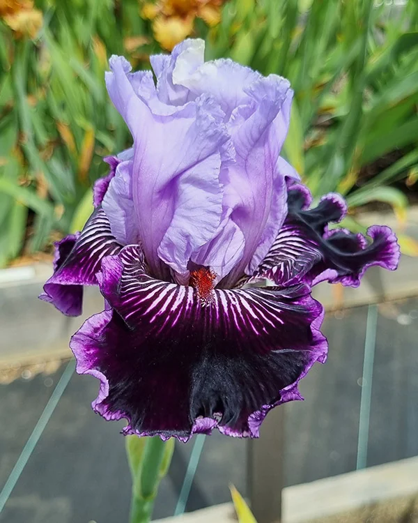 ‘By Jeeves’ (Barry Blyth, R. 2008). Seedling# O115-1. TB, 36″ (91 cm). Early midseason bloom. Standards lavender lilac; falls rich violet, well defined 1/4″ lilac edge, heavily veined white pattern around beards, very ruffled allowing lilac reverse to show; beards bright tangerine; slight sweet fragrance. ‘Gypsy Geena’ X ‘Decadence’. Tempo Two 2008/09