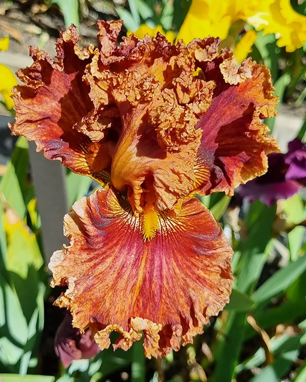 ‘Chestnuts Roasting’ (Lesley Blyth, 2010). Seedling# 04L-1-1. TB, 34″ (86 cm). Late midseason bloom. Standards medium brown, some gold at base of midrib; falls medium brown deepening at hafts to 1/3 of way down petal, ruffled, very laced; beards mustard gold; musky fragrance. ‘Decadence’ X ‘Ransom Note’. Tempo Two 2010/11.