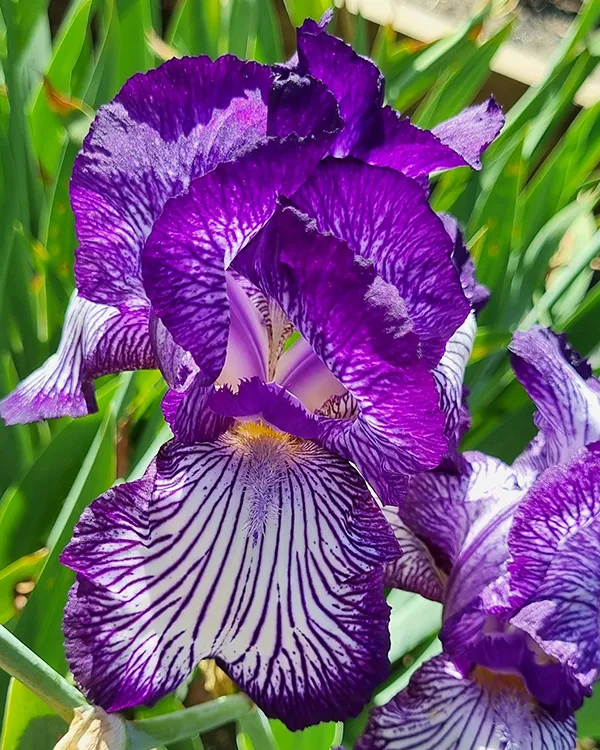 ‘Circus Stripes’ (Gordon Plough, R. 1975). Seedling 69-17-3. TB, 30″ (76 cm), Midseason bloom. Standards white, edges veined campanula violet, heavier at tip; falls white, overall veining of campanula violet; white to yellow beard. ‘Winner’s Circle’ X seedling 66-73-19, sibling. Eden Road 1976.
