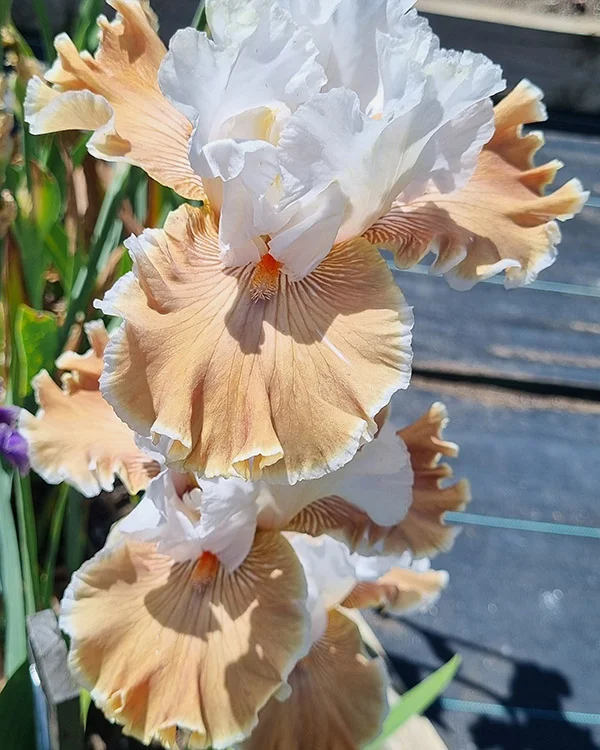 ‘Coffee Whispers’ (Barry Blyth, R/ 1999). Seedling# E112-3. TB, height 38″ (97 cm). Midseason bloom. Standards white, faint creamy midrib; falls coffee pink, blended light pastel lavender blaze, 1/8″ white edge; beards tangerine; sweet fragrance. Seedling# B178-2: (‘Wild Vision’ x ‘Imprimis’) X ‘About Town’. Tempo Two 1999/2000.