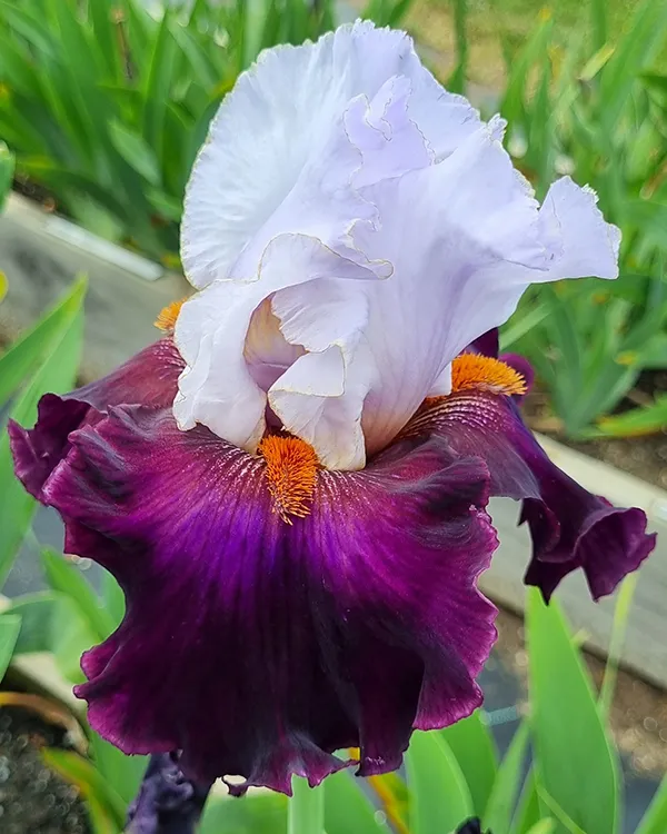 ‘Connection’ (Joseph Ghio, R. 1999). Seedling# 93-90P2. TB, 36″ (91 cm). Midseason to late bloom. Standards blue white; style arms yellow; falls purple, shoulders blended with red; beards red. Sibling to ‘Snowed In’. Bay View 2000. Honorable Mention 2002.