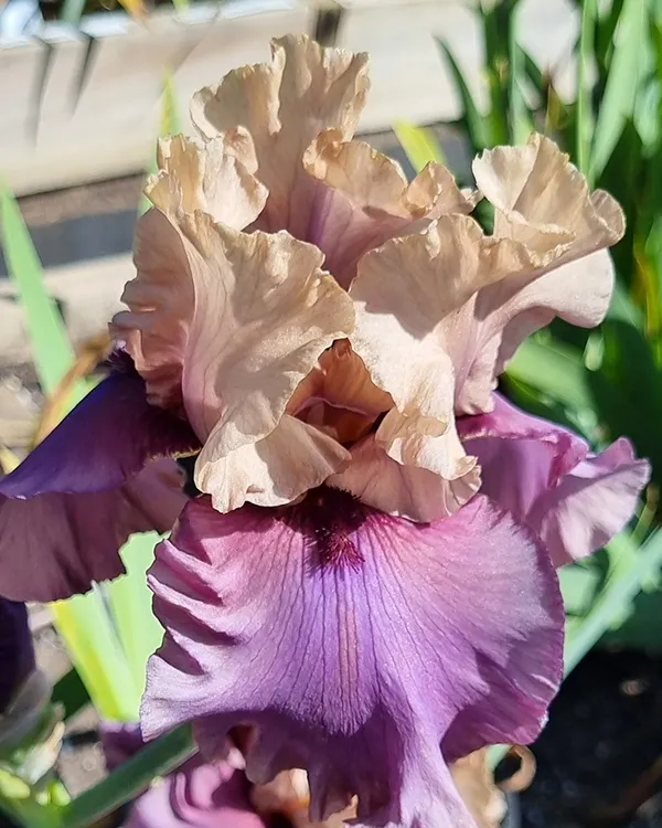 ‘Dance With Dragons’ (Barry Blyth, R. 2014) Seedling T122-1. TB, 40″ (102 cm), Early bloom. Standards tan-beige; Falls rose-violet blend, more red-violet on each side of beard; beards black-brown; slight sweet fragrance. ‘Enter the Dragon’ X ‘Chocolates And Silk’. Tempo Two 2014/15.