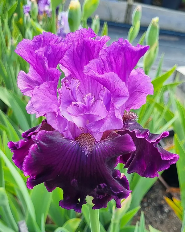 ‘Dangerous Liaison’ (Schreiner, R. 2011). Seedling SS 555-A. TB, 36 (91 cm), Midseason bloom. Standards and style arms violet (RHS 82B); falls dark purple (79A), thin violet rim; beards lavender yellow. ‘Starring’ X seedling KK 741-1: (‘Seakist’ x seedling DD 1196-1: (‘Burgermeister’ x seedling W 367-B: (seedling R 310-A, ‘Summer Fiesta’ sibling x seedling R 97-C: ‘King’s Tribute’ x seedling I 375-2: (‘Dusky Dancer’ x ‘Storm Flurry’))))). Schreiner 2011.