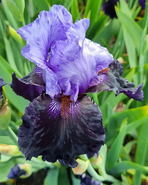 ‘Dangerous Mood’ (Schreiner, R. 2004). Seedling JJ 109-1. TB, 36″ (91 cm), Early midseason bloom. Standards and style arms light blue (RHS 97C), Falls black (202A); beards dark purple, hairs tipped yellow. ‘Dark Passion’ X seedling EE 141-2: (‘Northwest Progress’ x ‘Hello Darkness’). Schreiner 2004.