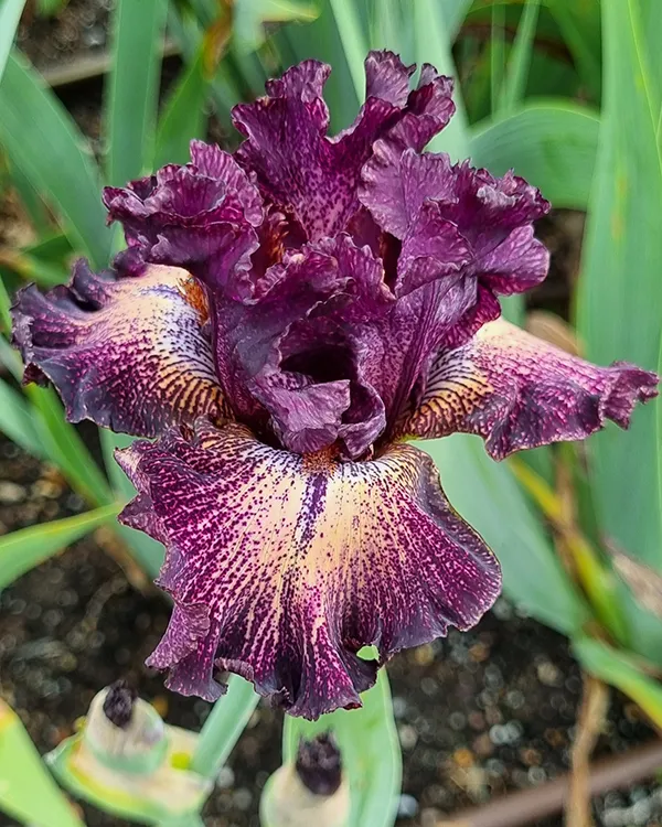 ‘Dark Drama’ (Keith Keppel, R. 2004). Seedling 96-10C. TB, height 36″ (91 cm), Rarly to midseason bloom. Standards plum (M&P 47-J-9), pinkish grey (44-C-1) ground barely showing in center and edges as small flecks; style arms greyed mauve (46-I-3); falls wide dotted cyclamen (47-L-9) band, ground peach buff (9-D-5) in center and veins, white beside beard; beards violet, tipped burnt sienna (5-F-12); slight fragrance. ‘Tangled Web’ X ‘Epicenter’ sibling to ‘Drama Queen’. Keppel 2005