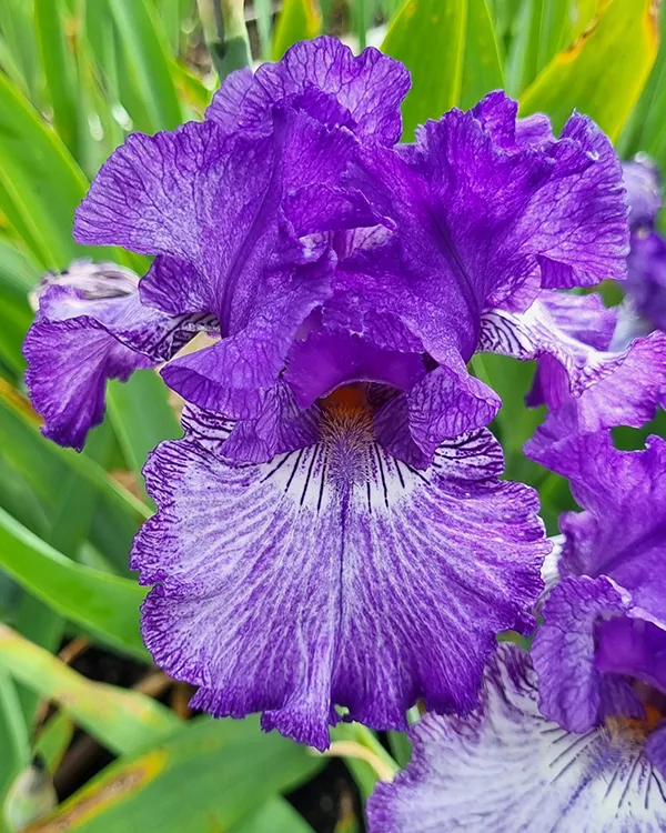 ‘Dear Arabella’ (John Charles Taylor, R. 2013) Seedling E32-08-1. TB, 34.5 (88 cm), Midseason bloom. Standards white ground, heavy blue-violet plicata markings; style arms blue-violet; falls white ground, blue-violet plicata lines and rim; beards orange-yellow tipped blue-violet; pronounced fragrance. ‘Momentous Occasion’ X ‘Cartoon’. Rainbow Ridge 2015/16.