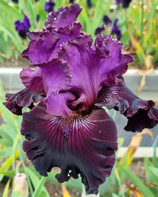‘Devil By Night’ (Barry Blyth, R. 2016) Seedling V149-2. TB, 36″ (91 cm). Midseason bloom. Standards rich red-purple deepening toward outside; falls velvety red-black; beards bronze-black. ‘Reckless Abandon’ X Keppel seedling 06-7A, ‘Cotillion Gown’ sibling. Tempo Two 2016/17