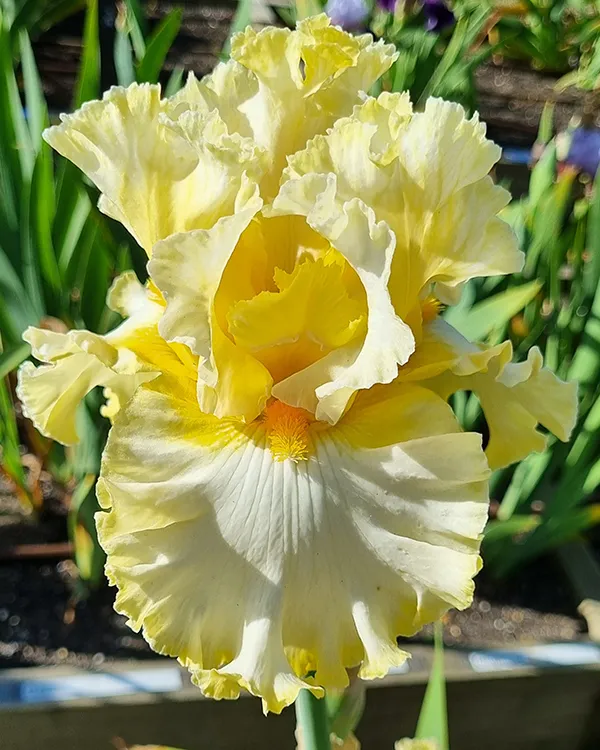 ‘Diamond Broker’ (Barry Blyth, R. 2014) Seedling W81-5. TB, 36″ (91 cm). Early to midseason bloom. Standards light lemon-cream lightening towards outer petal, ¼” frilled lemon-cream edge; style arms lemon-yellow, frilly; falls cream-white, hafts lemon-yellow, ¼” lemon-cream edge mostly on bottom of fall; beards golden yellow to light mustard; slight sweet fragrance. Seedling T334-1: (seedling O211-A, ‘Bequest’ pod parent, x seedling R85-1, ‘Heart of Dreams’ sibling) X ‘Magical’. Tempo Two 2014/15.