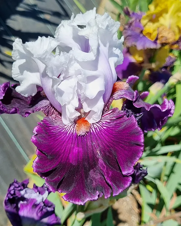 ‘Dinner Talk’ (Barry Blyth, R. 2005). Seedling M55-4. TB, 40″ (102 cm). Midseason bloom. Standards light pastel lavender, slightly deeper at midrib; falls rich red-violet, some texture veining overall; beards light burnt tangerine, faintly tipped brown. ‘Decadence’ X seedling K96-1: (‘Fogbound’ x ‘Starring’). Tempo Two 2005/06.