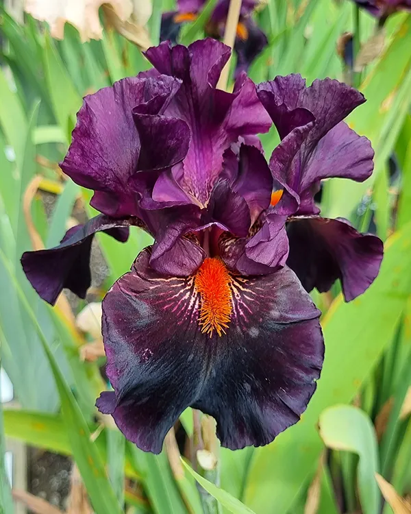 ‘Dracula’s Kiss’ (Schreiner, R. 2009). Seedling PP 602-A. TB, 36″ (91 cm). Late midseason bloom. Standards and style arms dark purple (RHS 79A); Falls dark purple-black (202A); beards tangerine. Seedling JJ 241-1: (seedling FF 77-1: (‘Old Black Magic’ x ‘Satin Satan’) x seedling CC 279-1: (seedling Y 682-2, pollen parent of ‘Diabolique’, x ‘Black Tornado’)) X ‘Local Color’. Schreiner 2009. Honorable Mention 2011, Award of Merit 2013.