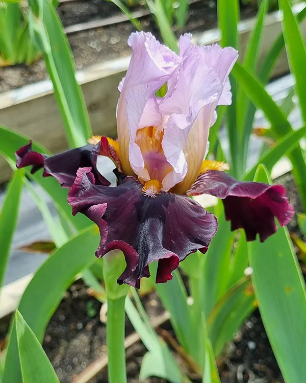 ‘Dream Lord’ (Barry Blyth, R. 1996). Seedling C185-1. TB, height 38″ (97 cm). Very early to early midseason bloom. Standards orchid to icy oyster; falls red burgundy, plush finish; beards bright mustard; slight fragrance. Seedling A153-3: (‘And Royal’ x ‘Electrique’) X seedling A80-2: (seedling Y2-1, ‘Royal Honey’ sibling, x ‘Chocolate Vanilla’). Tempo Two 1996/97.