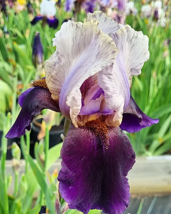 ‘Dusky Evening’ (Schreiner, R. 1971). Seedling A 711-D. TB, 36″ (91 cm). Midseason bloom. Standards grey to lavender-blue, subtly blended fawn tan; falls rich dark blue-black with overcast blending of brown; smoky blue-brown beard. ‘Marvalon’ X ‘Black Swan’. Schreiner 1971.