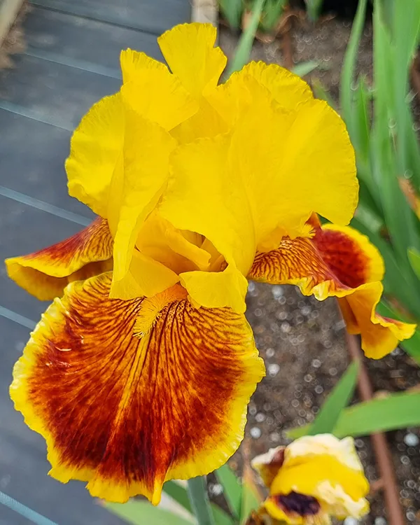 Fanfaron’ (Ben Hager, R. 1987). Seedling# T4152BrtVar. TB, height 38″ (97 cm). Midseason bloom. Standards deep yellow; falls deep bright red, 1/4″ yellow edge. ‘Dazzling Gold’ X seedling# T3455Br-Y Pc: (‘Santana’ x T3022RdPc: (unknown seedling x (‘Décolletage’ x (‘Sense Of Humor’ x ‘Dancers Veil’)))). Roris Gardens 1988. Honorable Mention 1990.