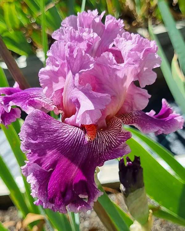 ‘Flutterina’ (Barry Blyth, R. 2009). Seedling# O54-A. TB, 40″ (102 cm), Midseason bloom. Standards pink infused lavender; falls fuchsia, 1/4″ edge of standards color, ruffled and laced; beards tango tangerine; slight musky fragrance. Keppel seedling# 98-117E, ‘Dearie’ sibling X ‘Louisa’s Song’. Tempo Two 2009/10.