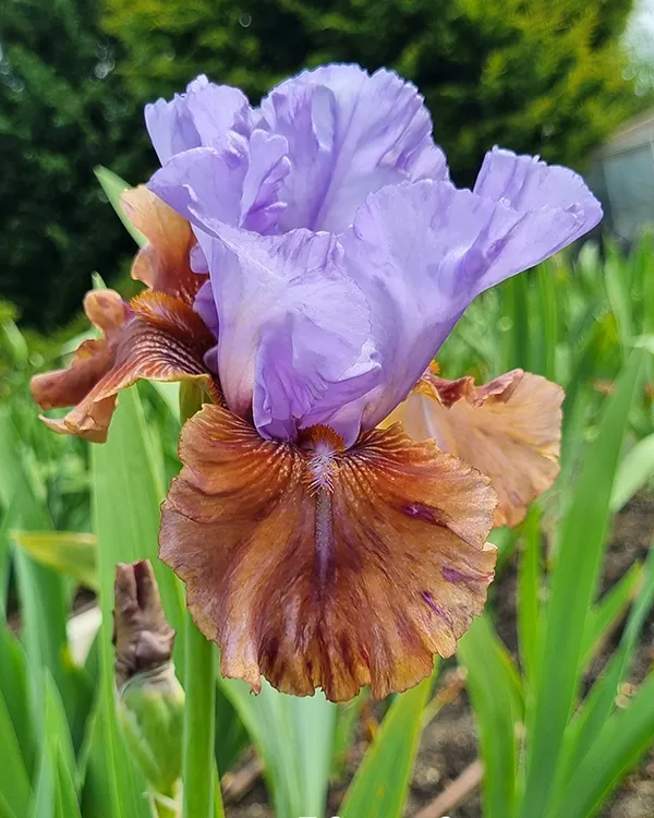 ‘Gaelic Jig’ (Barry Blyth, R. 1999). Seedling# F235-2. TB, height height 34″ (86 cm), Very early bloom. Standards lilac lavender; falls blended rosy brown, deeper toward haft, lavender underlay and fine centerline; beards white, heavily tipped light bronze; sweet fragrance. ‘Cast a Spell’ X seedling# D46-1, ‘Arabian Story’ sibling. Tempo Two 1999/2000.