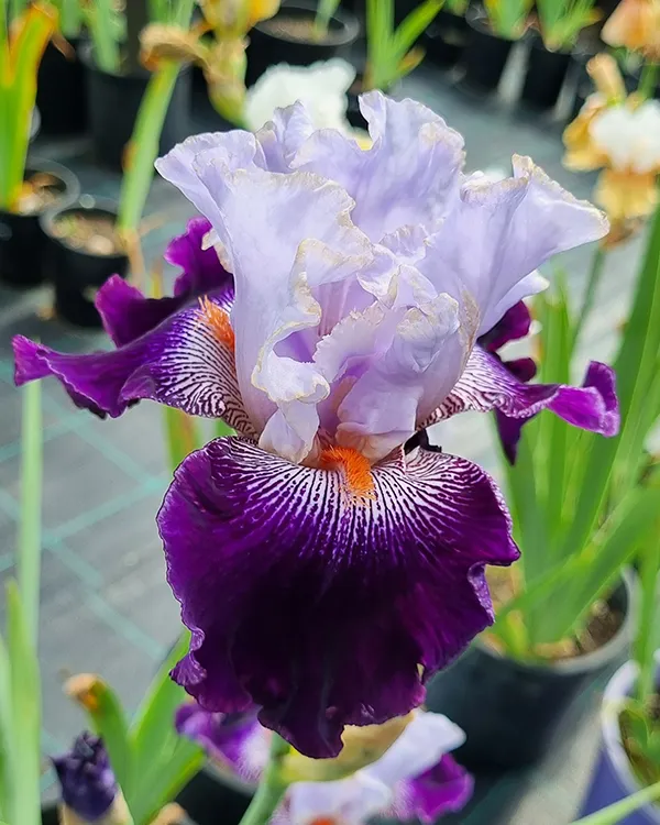 ‘Gentleman Jim’ (Barry Blyth, R/ 2001). Seedling# H162-1. TB, 36″ (91 cm), Midseason to late bloom. Standards snow white; falls red violet, some veining around apricot beard; slight fragrance. Seedling# E142-1: (‘Some Are Angels’ x K. Turner seedling# KH91-5-1: (‘Beaumonde’ x ‘Holiday Lover’)) X ‘Waiting For George’. Tempo Two 2002/03.