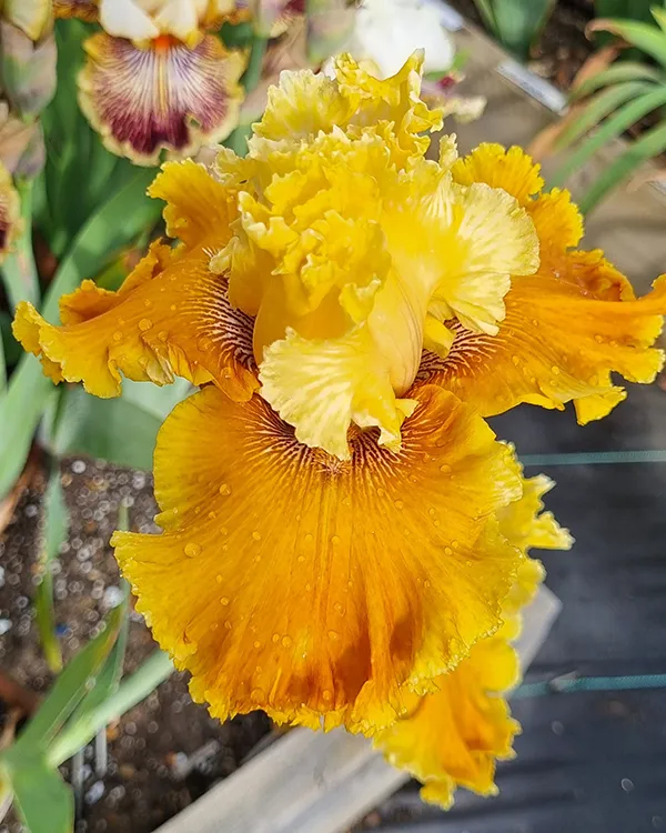 ‘Honey House’ (Barry Blyth, R. 2002). Seedling# H51-3. TB, 38″ (97 cm). Midseason to late bloom. Standards lemon yellow, deeper yellow around midrib, 1/4″ edge; falls yellow overlaid light tan deepening slightly at haft with few white haft marks, creamy lemon 1/4″ blended edge; beards white tipped old gold; heavily ruffled; sweet fragrance. ‘Power Of One’ X ‘Noble Contessa’. Tempo Two 2002/03.
