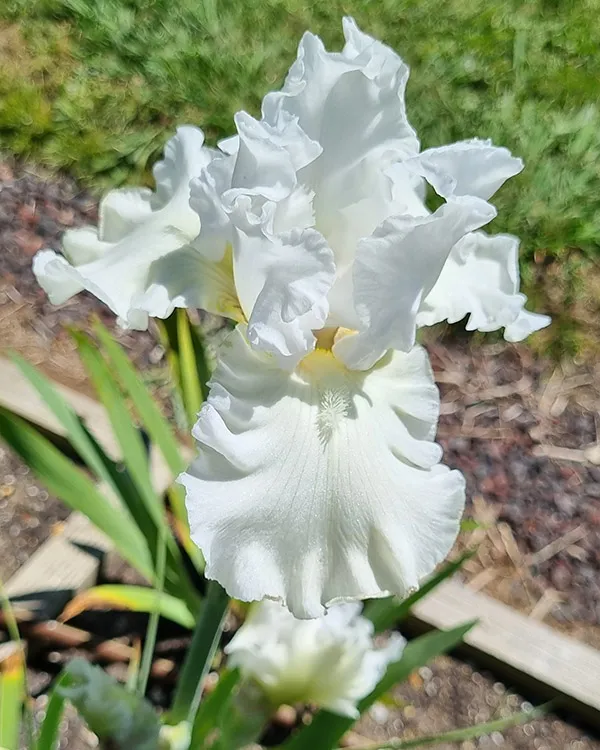 ‘Jayceetee’ (Graeme Grosvenor, R. 2001). Seedling# U163-1A. TB, 37″ (94 cm). Early bloom. White self; beards white; slight fragrance. ‘Skating Party’ X ‘Scandia Delight’. Rainbow Ridge 2001/02. Australian Dykes Medal 2004.