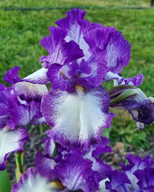 ‘Jesse’s Song’ (Bryce Williamson, R. 1979). Seedling# 65773. TB, height 36″ (91 cm), Midseason bloom. Standards white center, sanded into a solid methyl violet band; falls white plicata edge of methyl violet, sanded into a clean white ground; lemon beard tipped blue-white. Seedling# 474-1: (‘Charmed Circle’ x ‘Kiss’) X Iris Nelson seedling# 34-74A: (‘Smoke Rings’ x ‘Décolletage’). Pacific Coast Hybridizers 1983. Honorable Mention 1985; Award of Merit 1987; American Dykes Medal 1990.