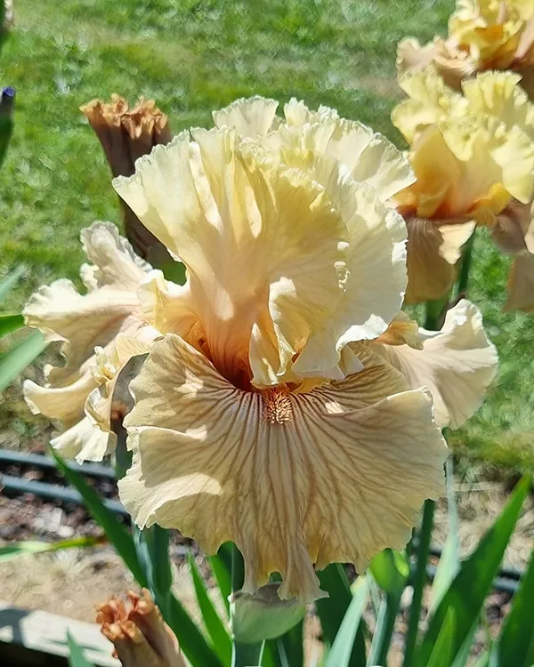 ‘Just Crazy’ (Barry Blyth, R. 2007). Seedling# N187-3. TB, 36″ (91 cm), Early midseason bloom. Standards light coffee to coffee honey; falls slightly deeper than standards, deeper coffee-brown veins overall; beards tangerine bronze in throat, lavender tipped coffee bronze at end; musky fragrance. ‘Chardonnay And Ice’ X ‘Reckless In Denim’. Tempo Two 2007/08.
