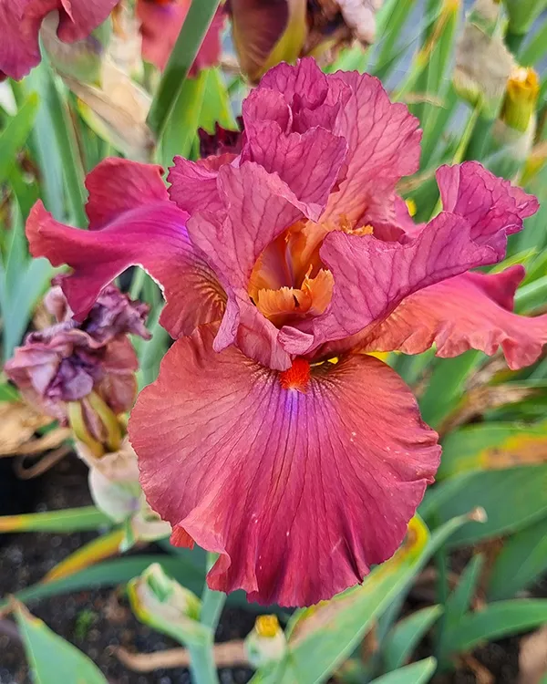 ‘Lady Friend’ (Joseph Ghio, R. 1980). Seedling 76-126-O. TB, 38″ (97 cm). Very early to early bloom. Garnet red; red beard. ‘Indian Territory’ X ‘Countryman’. Bay View Gardens 1981. Exhibition Certificate 1980; Favorite Guest 1982; Honorable Mention 1983; Award of Merit 1985; Nelson Award 1985.