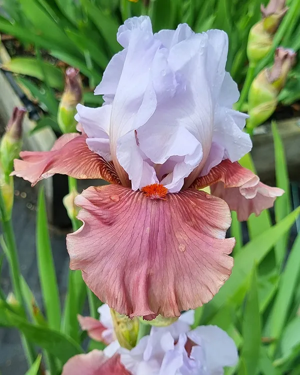 ‘Leaps And Bounds’ (O. David Niswonger, R. 2001). Seedling# 66-97. TB, height 30″ (76 cm). Midseason bloom. Standards white, hint of blue; style arms white; falls pink fuchsia; beards dark tangerine. ‘Betty Dunn’ X ‘Imprimis’. Cape Iris 2001.