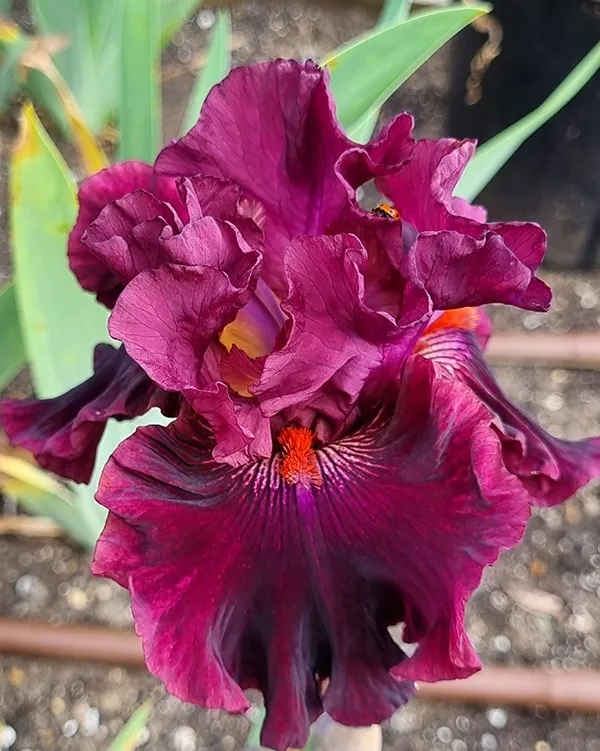 Machismo’ (Barry Blyth, R/ 2003). Seedling# J150-2. TB, height 36″ (91 cm), Midseason to late bloom. Standards burgundy to ruby; falls plush burgundy to burgundy black, lighter 3/8″ suffused edge; beards bright tango orange; ruffled, flared; slight sweet fragrance. Seedling# G74-4, ‘Wearing Rubies’ sibling, X seedling# G50-1: (‘Island Gossip’ x ‘Who’s Your Daddy’). Tempo Two 2003/04.
