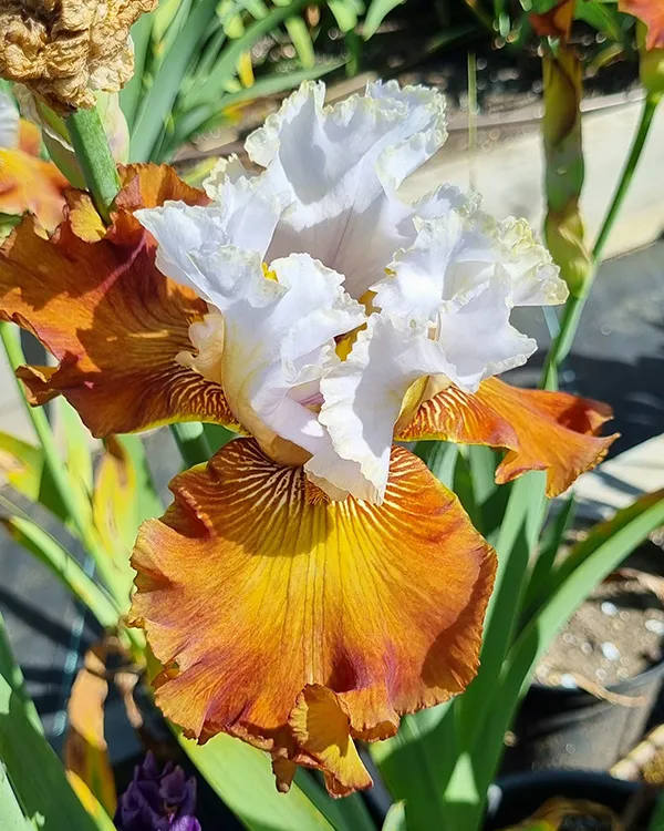 ‘Milk In My Coffee’ (Barry Blyth, R. 2014) Seedling# U226-1. TB, 36″ (91 cm), Very early bloom. Standards white, faint olive-yellow at base of midrib; falls mid brown lightening slightly towards center as flower ages; beards mustard-yellow; slight sweet fragrance; has rebloomed in winter. Seedling# S279-1: (seedling# O228-4: (seedling# L133-7, ‘I’m Dreaming’ sibling x seedling# L304-1, ‘Platinum Class’ sibling) x ‘Another Woman’) X ‘Pirate Queen’. Tempo Two 2015-16.
