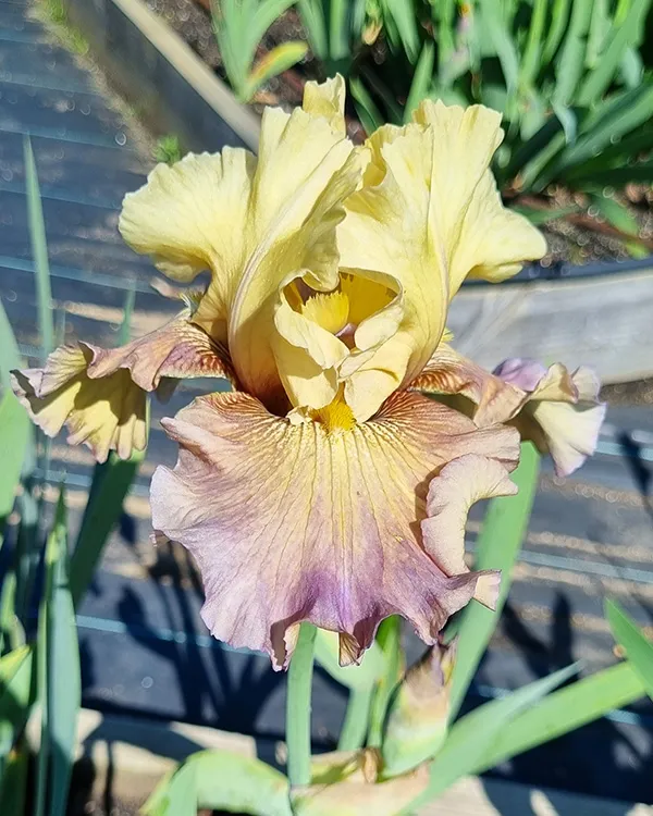 ‘Misty Ridge’ (Barry Blyth, R/ 2002). Seedling# J141-3. TB, height 36″ (91 cm), Early to midseason bloom. Standards muted lemon to lemon buff; falls lemon, heavily overlaid soft violet, hafts deeper lemon green; beards lemon yellow; pronounced sweet fragrance. ‘Wishful Thinking’ X seedling# F160-1: (seedling# D46-1, ‘Arabian Story’ sibling x ‘Cast a Spell’). Tempo Two 2003/04