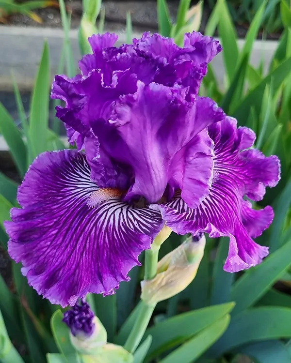 ‘Mulberry Magic’ (Barry Blyth, R. 2009). Seedling# Q77A-1. TB, 35″ (89 cm). Very early bloom. Standards rich lilac; falls lilac, overall deeper purple veining, some white veining beside beard; beards white tipped tangerine; slight sweet fragrance. ‘By Jeeves’ X seedling# N273-B: (‘Taste The Magic’ x ‘Reckless in Denim’). Tempo Two 2009/10.