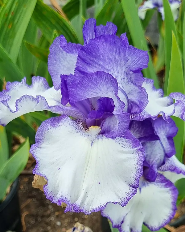 ‘My Friend Joyce’ (Graeme Grosvenor, R. 2011). Seedling# D177-04-3. TB, 37″ (94 cm), Early to late bloom. Standards white, wide blue-violet plicata edge; style arms dark blue; falls white, narrow darker blue-violet plicata edge; beards white tipped lemon; slight sweet fragrance. Seedling# A164-3: (‘Zip It Up’ x ‘Reap The Rewards’) X ‘My Sister Janet’.