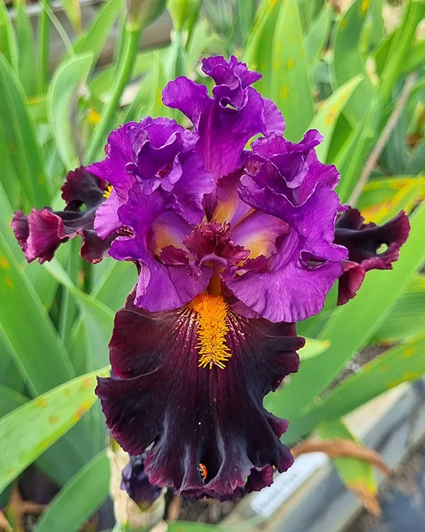 ‘Naughty Nights’ (Keith Keppel, R. 2005). Seedling# 98-181J. TB, height 34″ (86 cm), Late to very late season bloom. Standards roman purple (M&P 44-K-10) lightly shaded greyed rose (6-H-2) at base; style arms violet (43-H-10), edges empire yellow (9-K-3), crests blended coronation purple (46-L-8); falls velvet blackish port (darker than 56-E-12); beards cadmium orange (9-K-9/10), spanish yellow (10-L-7) at end. Seedling# 93-63F: (‘Magharee’ x ‘Overjoyed’) X seedling# 93-77A: (seedling# 89-99A: (‘Witch’s Wand’ x ‘Witches’ Sabbath’) x ‘Romantic Evening’). Keppel 2006. Honorable Mention 2008.