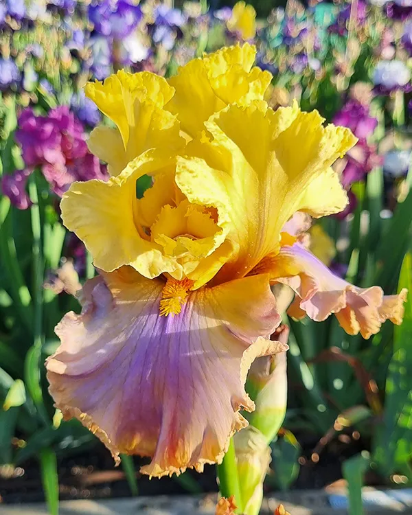 ‘Noble Poet’ (Barry Blyth, R. 2006). Seedling# M53-3. TB, 38″ (97 cm), Late midseason bloom. Standards lemon gold; falls tan, deeper at hafts, broad blue blaze extending over most of falls; beards mustard gold; slight spicy fragrance. ‘Decadence’ X ‘Final Episode’. Tempo Two 2006/07.