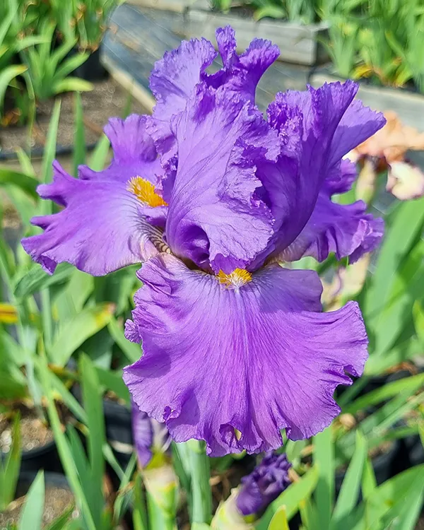 ‘Normality’ (Graeme Grosvenor, R. 2011) Seedling# F91-1. TB, 36″ (91 cm), Early bloom. Standards blue mauve-violet, lacy; falls blue mauve, lighter around beard, darker violet influence at edge; beards white base, hairs tipped orange yellow. ‘Howes Valley’ X ‘Adlemi’.