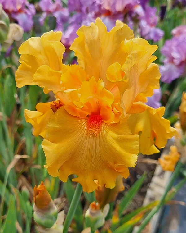 ‘Oh James’ (Barry Blyth, R. 1995). Seedling# A137-2. TB, 42″ (107 cm). Early to late bloom. Iridescent orange self; beards matching. Seedling# X140-1, ‘Legato’ sibling, X seedling# X127-1: (seedling# S128-A: (‘Hush At Twilight’ x seedling#!P115-A: ((‘Love Chant’ x ‘Festive Skirt’) x (‘Caramba’ x ‘Pink Ember’))) x seedling# U82-B, ‘Samurai Silk’ sibling). Tempo Two 1995/96.
