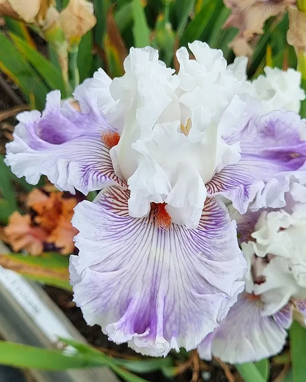 ‘Organza’ (Barry Blyth, R. 2015) Seedling# V337-2. TB, 36″ (91 cm). Early to midseason bloom. Standards pure white; falls white overlaid with violet wash more pronounced towards hafts, ¼˝ white edge; beards muted lightly burnt tangerine; slight sweet fragrance. ‘In High Heels’ X ‘Hello Beautiful’. Tempo Two 2015-16
