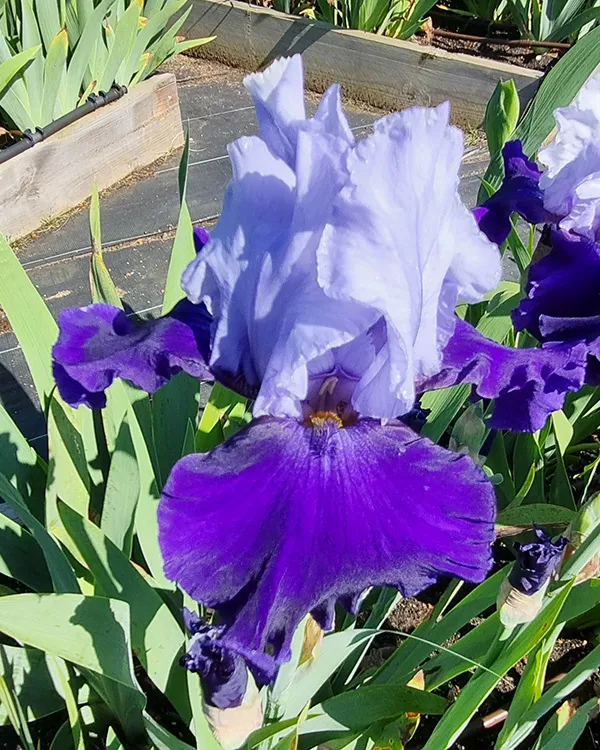 ‘Over Alaska’ (Schreiner, R. 2003). Seedling# GG 5-1. TB, 36″ (91 cm), Early thru midseason bloom. Standards white, blue (RHS 91D) wash; style arms blue white; falls dark blue violet (93A); beards blue, gold base. ‘Ride The Wind’ X ‘Royal Intrigue’. Schreiner 2003.