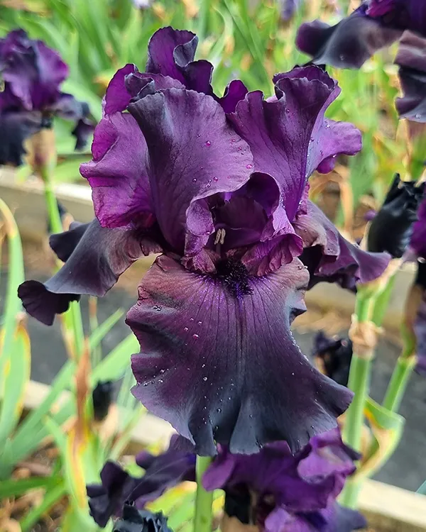 Paint It Black’ (Schreiner, R. 1994). Seedling# AA 414-B. TB, 36″ (91 cm), Late midseason bloom. Standards deep reddish purple (RHS 79A); falls blackish purple (202A); beards black; ruffled. Seedling# V 94-2: (‘Black Dragon’ x seedling# R 167-A: ((seedling# W 1107-BB: ((‘Dark Boatman’ x seedling# N 364-1) x ‘Black Swan’) x seedling# D 232-3, ‘Navy Strut’ sibling) x ‘Storm Flurry’)) X seedling# N 273-A, ‘Back In Black’ sibling. Schreiner 1994.