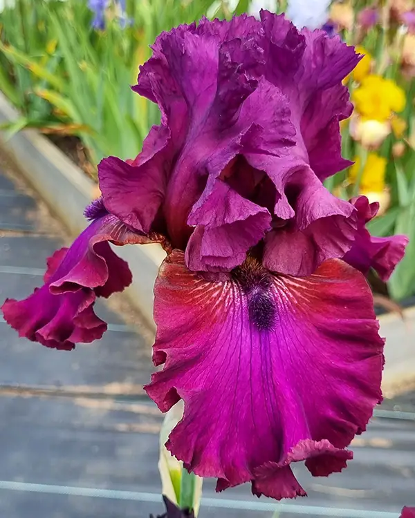 ‘Palace Symphony’ (Barry Blyth, R. 2006). Seedling# N228-1. TB, 36″ (91 cm), Midseason bloom. Standards light magenta-burgundy, bronze blush at midrib; falls bright light magenta-burgundy, bluish wash at center, bronze hafts; beards bronze, outer half purple bronze; slight sweet fragrance. ‘Swingtown’ X ‘Decadence’. Tempo Two 2006/07