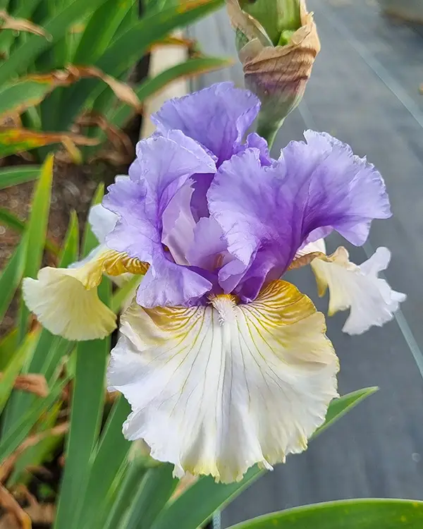 ‘Party’s Over’ (Duane Meek, R. 2005) Seedling# 36-4-9. TB, 34″ (86 cm). Early midseason bloom. Standards soft lavender blue, midrib deeper; style arms pale lavender around blue stigmatic lip; falls ivory, faintly flushed lavender around beard, hafts yellow; beards ivory, hairs tipped pale yellow; ruffled. ‘Color Magician’ X ‘Champagne Frost’. D. & J. Gardens 2005.