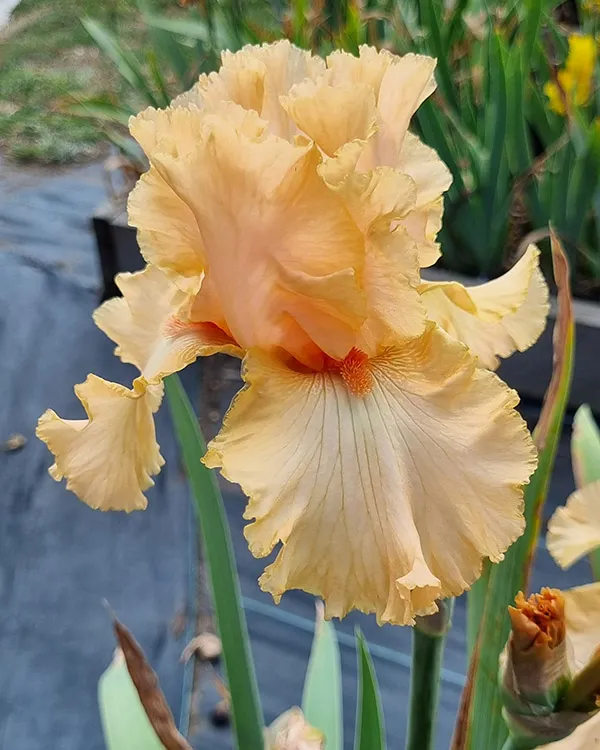 Qualified'(Graeme Grosvenor, R. 1999). Seedling# V23-2. TB, 32″ (81 cm). Late midseason bloom. Apricot peach pink self; beards tangerine; sweet fragrance. ‘Larcenist’ x ‘Bogota’. Rainbow Ridge 1999/2000.